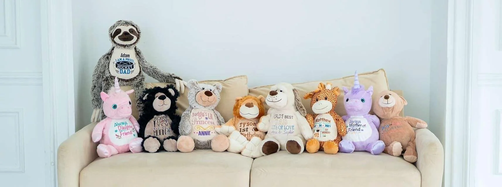 One of our most popular “Odds + Ends” items is our customizable animals and sports stuffies!